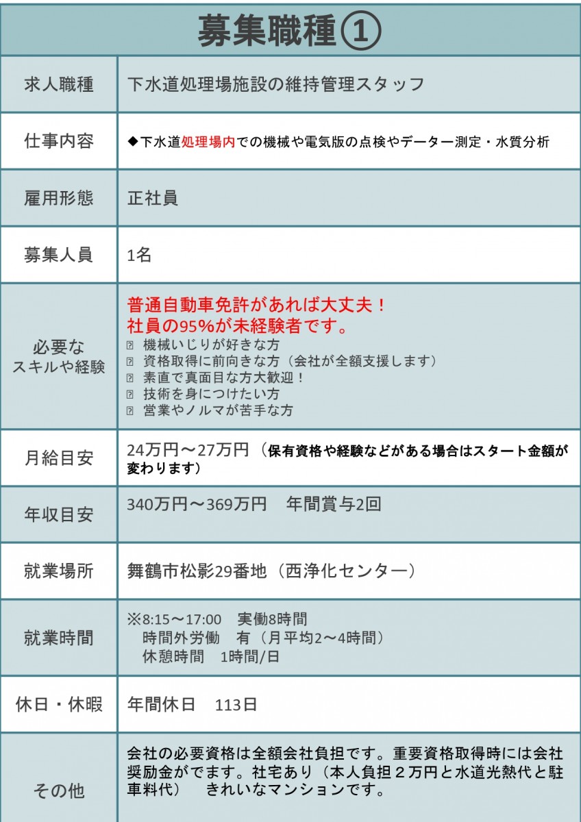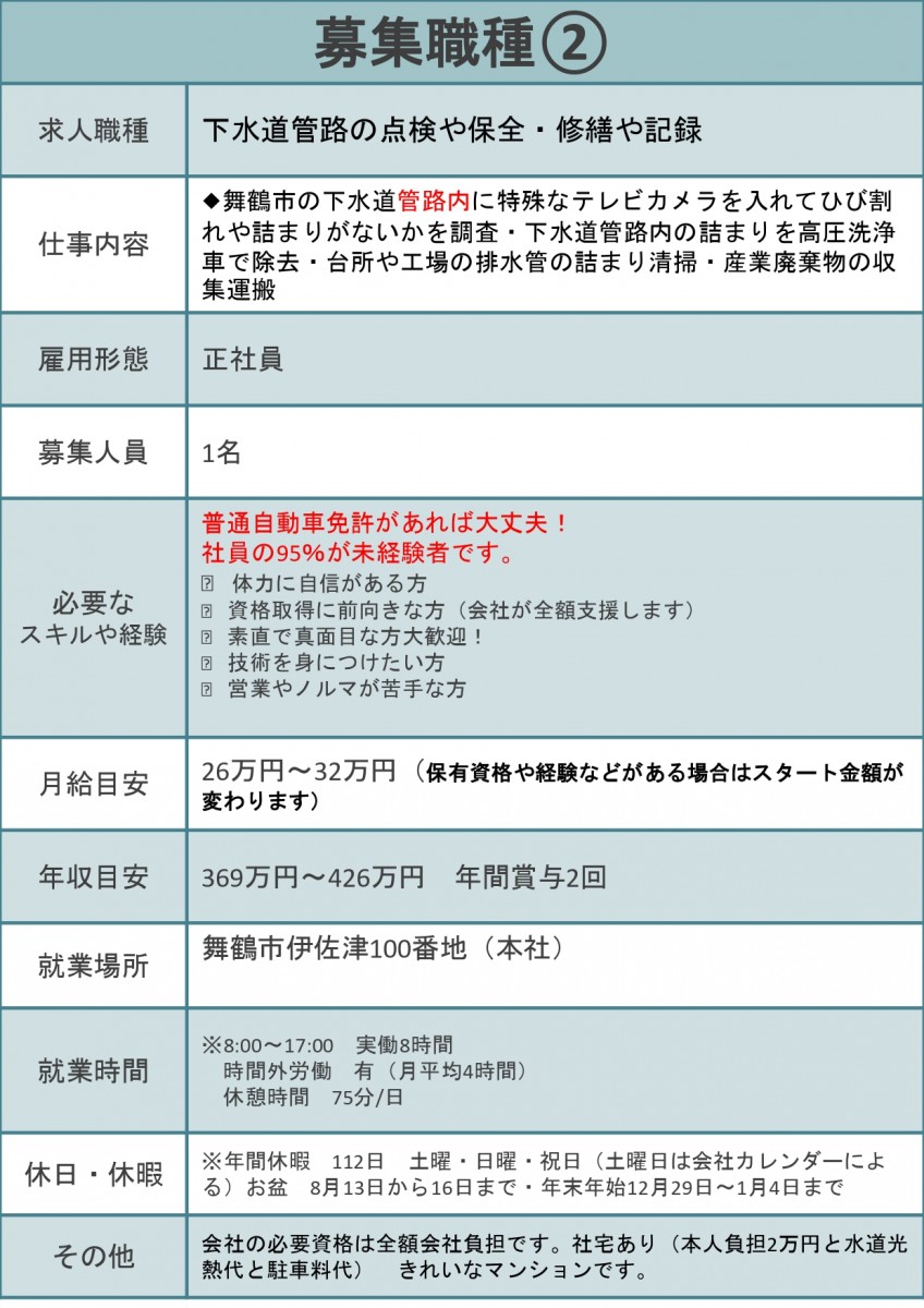 令和8年 社員募集! 2026/01/16 下水道など公共インフラを支える仕事を行っています。業務に必要な資格取得も会社がサポートします。まずば現場見学から仕事内容や雰囲気を見てからご応募いただけます。